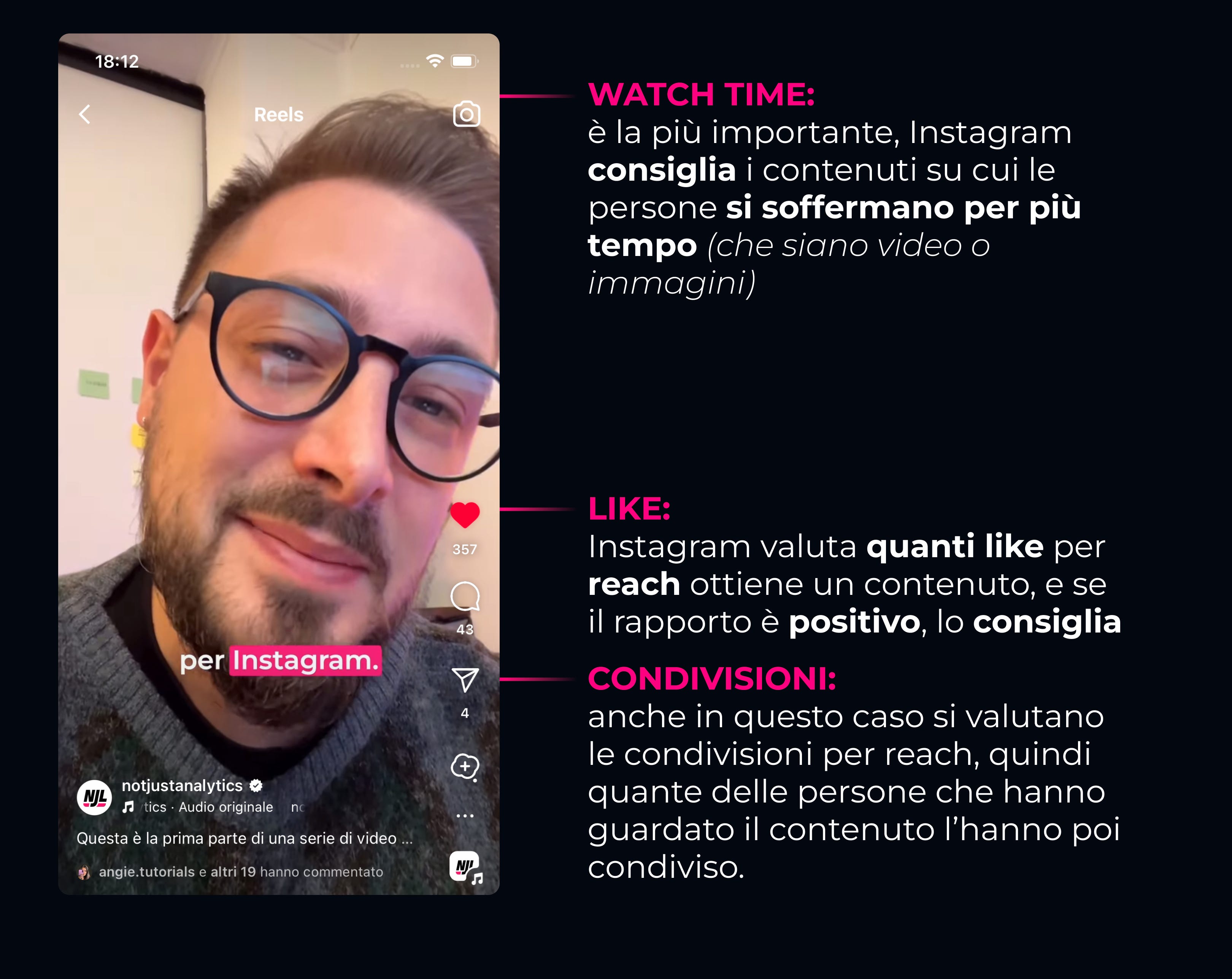 Watch time: il KPI più importante. Quanto più le persone si fermano sul tuo contenuto, tanto più aumentano le opportunità che venga consigliato – che sia reel, carosello o immagine singola poco conta!